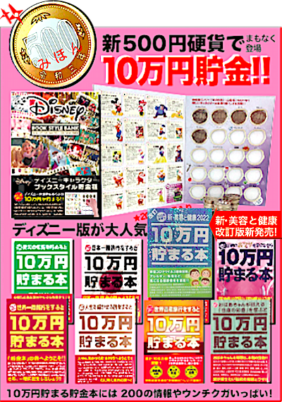 500円硬貨が 10,000円。左頁にはテーマにちなんだ情報や